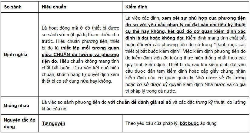 Kiểm định (hay kiểm nghiệm) là hoạt động đánh giá, xác nhận đặc tính kỹ thuật đo lường của phương tiện đo theo yêu cầu kỹ thuật đo lường.Hiệu chuẩn là xác định, thiết lập mối quan hệ giữa giá trị đo của chuẩn đo lường, phương tiện đo với giá trị đo của đại lượng cần đo.