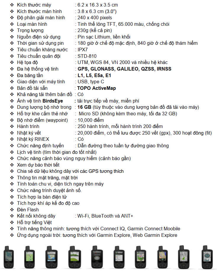 Xem lộ trình rõ ràng hơn với màn hình màu 3” có thể đọc dưới ánh sáng mặt trời. Di chuyển xa hơn với thời lượng pin lên tới 180 giờ ở chế độ GPS và 840 giờ ở chế độ thám hiểm. Định vị vị trí của bạn trong các điều kiện khó khăn với công nghệ đa băng tần và hỗ trợ GNSS mở rộng. Xem địa hình lộ trình sắp tới với hình ảnh vệ tinh rõ ràng được tải ngay về thiết bị điều hướng của bạn. Luôn được cập nhật với tính năng dự báo thời tiết khi được kết nối với điện thoại thông minh tương thích của bạn.