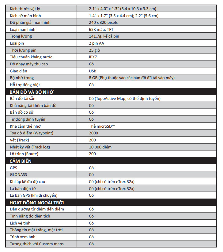 eTrex 22x và eTrex 32x cung cấp cùng mức độ dễ sử dụng, độ bền và tiện dụng mà dòng GPS cầm tay eTrex được biết đến - cùng với các bản đồ TopoActive được tải sẵn. Những thiết bị này hoàn hảo cho ATV, xe đạp, thuyền hoặc đi bộ đường dài.