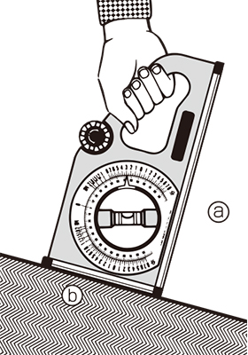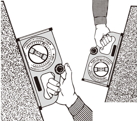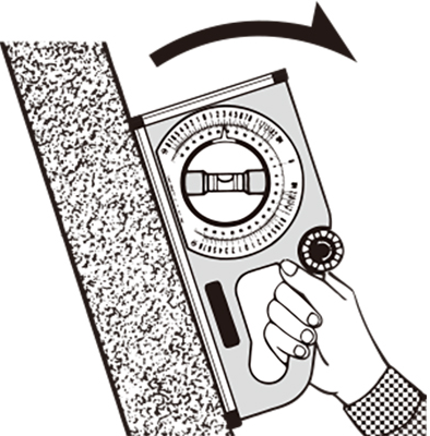1. Áp bề mặt đo "nghiêng" vào đối tượng cần đo. 2. Xoay nút xoay cho đến khi bọt khí ở giữa lọ. 3. Đọc đầu kim trên mặt đồng hồ. ●Có thể thực hiện phép đo theo cả hướng lên và hướng xuống.